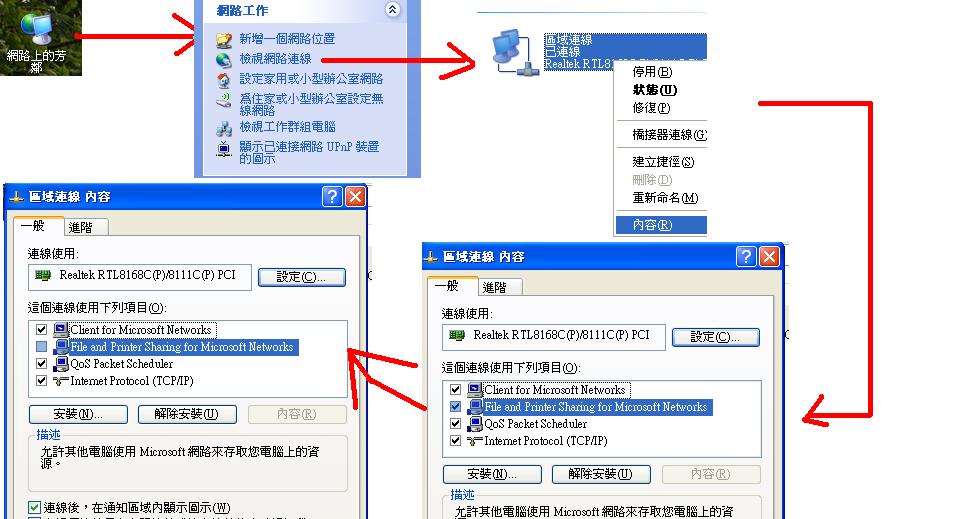 (其实也应该关掉这个,看图...进入网络上的芳邻----按检视网络联线------右键区 联线(这里的情况每个人都不同,但是最后的设置都一样)----内容-------撤消第二个的勾)