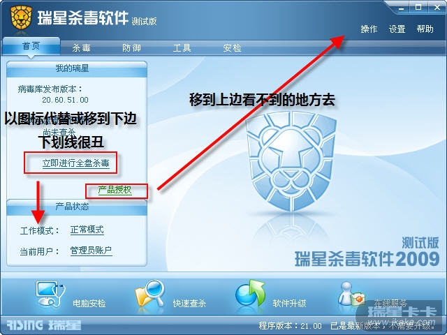 主界面上的产品授权建议移到“操作”“设置”“帮助”那里去,毕竟很少用到尤其是对标准版用户,看一年根本不用的东西放到显眼的地方很累