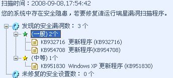 我的操作系统已经是win xp sp3,原先升级瑞星杀毒软件和防火墙都没有出现任何漏洞提示,只是在今天升级后,用漏洞扫描才发现有3个漏洞的。