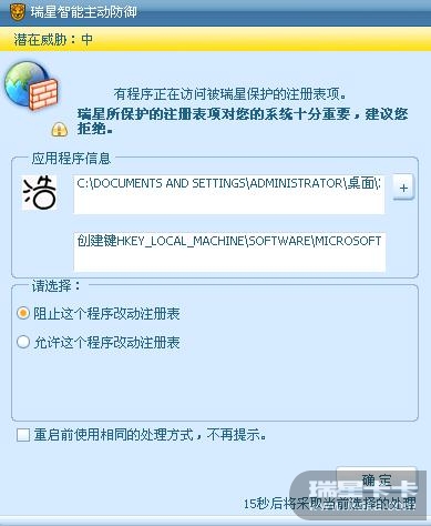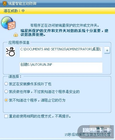由于瑞星能查出这个病毒所以将文件监控关了,在将主动防御里系统加固能打的勾都打上了,运行病毒,随后瑞星就提示了