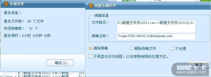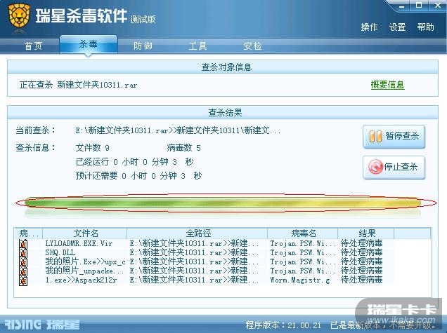 瑞星程序版本:21.00.21(XP系统),扫描任何病毒压缩包,还没扫完,进度条进到底了,提示扫完病毒,才出先病毒询问,让我选择(应该是BUG,工程师测试看看吧)