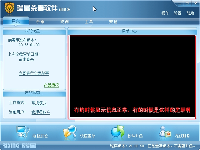 六、在没有进行全盘杀毒的时候在,软件首页左侧有提示并且点击后可以全盘杀毒,但是全盘后左侧没有那个提示并且没办法点击全盘杀毒,要想全盘杀毒的话还得切换到杀毒标签才可以实现,不在像08版那样在首页底下就有全盘杀毒的按钮,很不方便