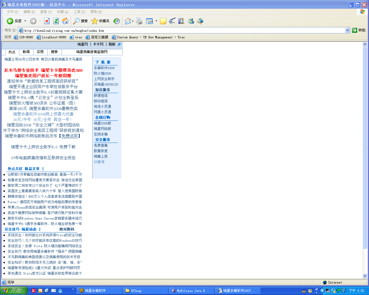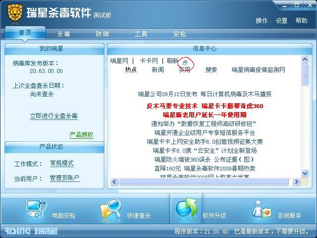 首页 » 企业产品讨论区 » 瑞星2009公测 » 瑞星2009测试版问题反馈 » 瑞星杀毒软件2009公测 » 信息中心里,刷新后面的恢复按钮,链接错误