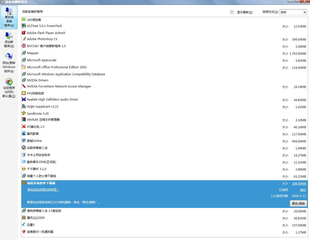 然后我就想卸载重新安装,结果卸载完,重新下载的瑞星却安装不了,说我机子上有瑞星了,后来我上网查彻底删除瑞星的方法,也照样删了; ,接着就是重新安装,可是安装到3/2就蓝屏,每次都是3/2的时候蓝屏,我试了3次,都蓝屏!后来一直蓝屏!我就重装系统了!