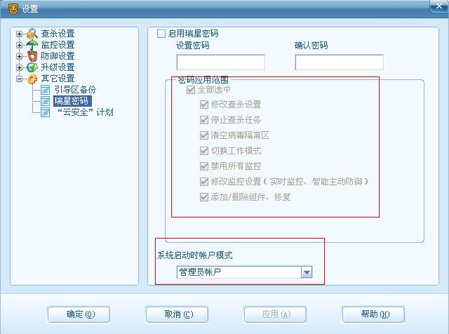 勾选该图的“启用瑞星密码”,下边各项才为可选状态。