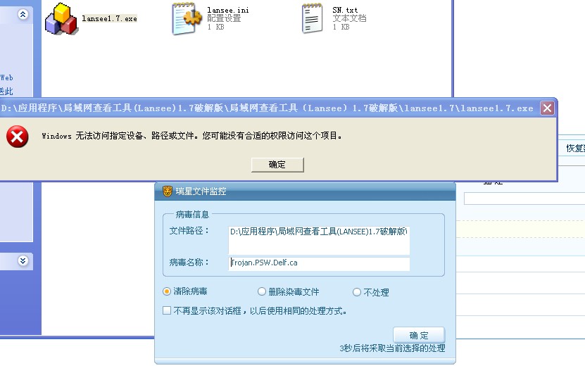 浏览器及版本:IE6瑞星软件版本:21.00.40涉及的其它软件版本:Lansee 1.7问题现象:以前使用任何杀毒软件都没有把它当成病毒,使用瑞星2009后程序无法启动,关闭所有监控,程序运行正常。问题能否复现:是