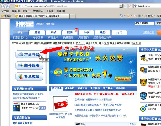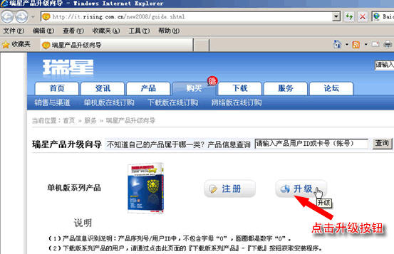 产品升级中点击“升级”按钮(如刚购买的产品还没注册则先要点击“注册”来完成注册)