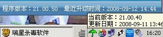 我刚才手动点击主面板上的“软件升级”,提示升级程序正在运行,我不知道它运行有多久了,反正我上网电脑都开了五六个小时了,我就等,一会儿,主面板和监控全部自动关闭退出了,什么提示也没有,我以为是升级更新程序,没在意,但等了几分种,监控的伞还没出来,我就在开始--程序里手动把监控打开,伞是出来了,我一看版本,还是21.00.40,难道没升级成功,我就又把主面板打开,发现主面板上现实的版本信息是21.00.50,我就奇怪了。我想可能是2009测试版的更新部分有点问题,以前用2008的一直很正常。