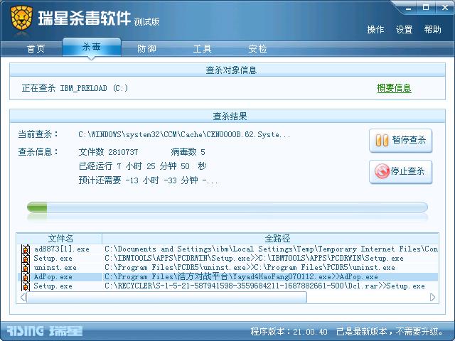 出现问题前的操作步骤:今天我上午运行了瑞星杀毒软件进行全盘扫描,下午出去办了点事情,回来的时候发现瑞星连一块硬盘都没有扫描完成,而且奇怪的是时间竟然成了负数。具体为什么成为这样我不知道,升级到最新的版本后由于时间来不及也没有进行测试。以前貌似没有发生过这样的情况。2009难道是拆包拆的太多了??扫描的目录是微软SMS补丁分发系统中的文件,单独扫描该目录都需要几个小时,可能是我这个目录的文件太多造成的