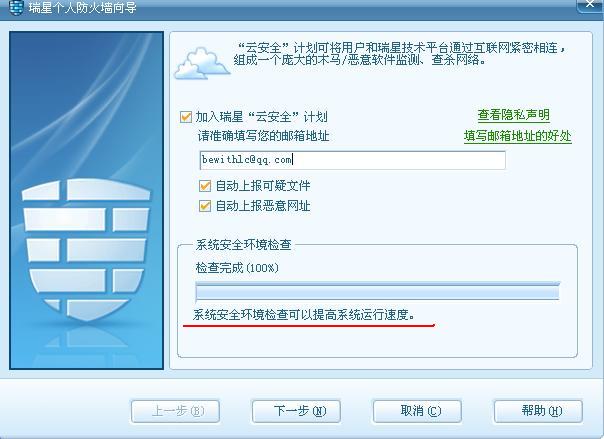 另外,云安全界面中“可以提高系统运行速度”是否不妥?系统环境检测应该提高的是防火墙的运行速度吧?