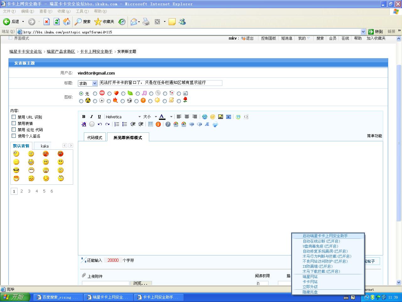 首页 » 个人产品讨论区 » 瑞星其他产品 » 瑞星安全助手 » 卡卡上网安全助手 » 无法打开卡卡的窗口了,只是在任务栏通知区域有显示运行