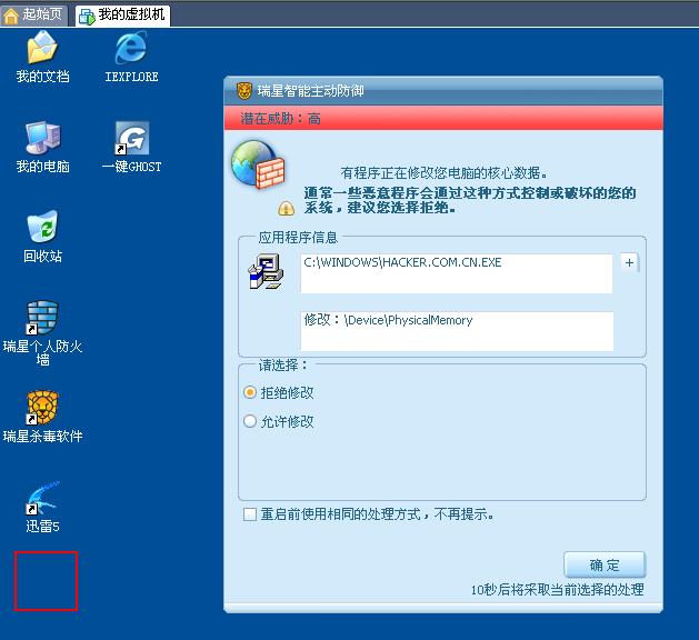 打开防火墙,查看系统信息-进程信息,查到了hacker.com.cn.exe正在运行!瑞星杀毒软件的文件监控不能检测到该病毒。