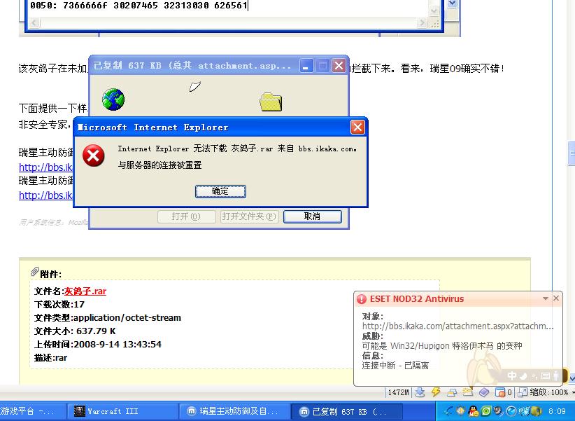 该灰鸽子在未加入瑞星病毒库的条件下,依旧被瑞星的主动防御及防火墙成功拦截下来。看来,瑞星09确实不错!