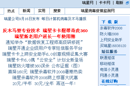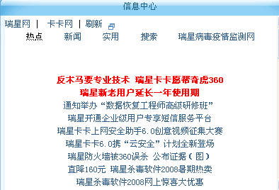相对来说我觉得瑞星的软件界面比较美观,2009也不错。但是这次看到了2009的信息中心,感觉不怎么样,可能是测试版的原因,没有深化设计,建议以后信息中心可以改的更好些。下面一幅是瑞星2009信息中心图片,:kaka6:另一幅是浏览器显示的差异比较大。:kaka8: 虽然写着是2007版的信息中心