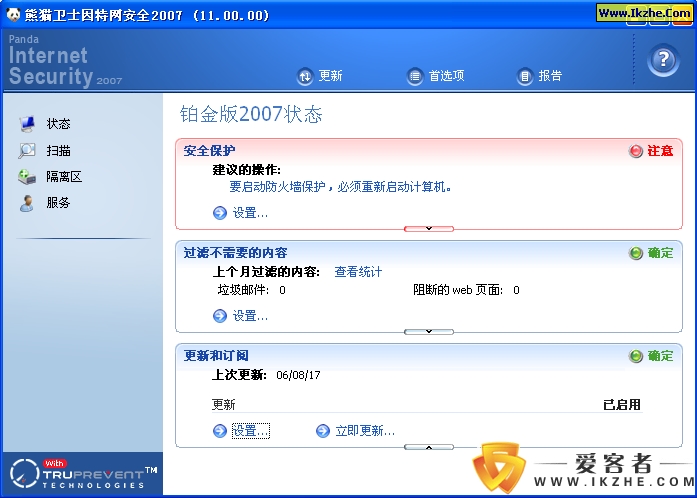 保护状态下分为主页,系统监控,主动防御,防火墙等几大基本功能区块。其中,主页呈现的是系统监控,主动防御等子功能区块的工作状态,这样使系统监控,主动防御等标签页中能显示更加详细的内容。瑞星以往的信息中心,虽然能提供一些厂商信息及威胁信息,但实际效果并不是很好,反而占据了很多界面资源,损失了美感。其实,厂商信息及威胁信息可以通过弹框来提示用户。如某恶性病毒爆发,瑞星立刻在桌面右下角弹出该病毒的相关信息及解决办法。当然,瑞星需给用户选择是否使用该功能。若用户不想被这类对话框打扰,能够在设置中取消。动态的变化会使UI更加出色。如鼠标移到某字体时,字体变换颜色;鼠标移到图标时,图标呈现动态变化等等。瑞星的声音提示也过于单调。目前安全软件的声音效果都不是很好。卡巴8.0在这方面有所进步。瑞星如果能在声音效果方面做点功夫,肯定能给用户更加完美的使用感受。声音效果可以加在对话框弹出时,也可以是在鼠标切换功能页面时。