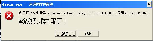 应用程序 C:\WINDOWS\system32\dwwin.exe 产生了一个应用程序错误 此错误发生在 09/16/2008 @ 10:05:18.546 所产生的意外情况为 80000003,在地址 7C92120E (ntdll!DbgBreakPoint)处