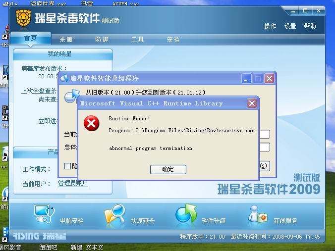 出现问题前的操作步骤:安装完瑞星2009测试版杀毒软件后,重启电脑开始升级