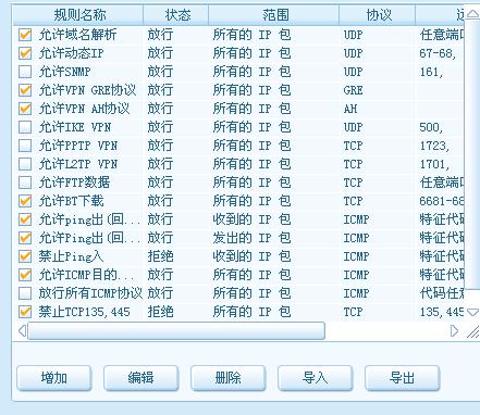 开了bt下载和禁止135,445端口两个规则,如果开了Ftp服务器就沟了允许Ftp数据。