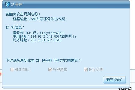总弹出SMB共享服务攻击代码拦截,是怎么回事,想把弹出窗口的钩去掉,也去不掉,因为是灰色的,不可用。如图: