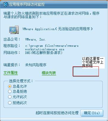 问题现象:运行VMWARE,弹出应用程序网络访问监控,并且瑞星提示是:未知风险程序。那怎么昨天还有的可疑文件功能今天没有了?