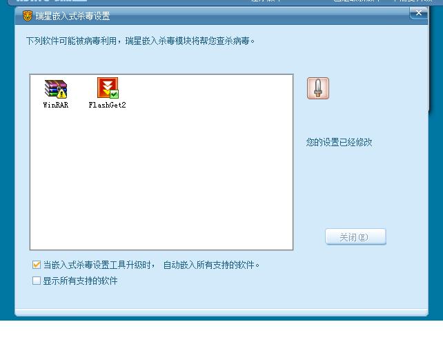 运行瑞星,嵌入式杀毒设置中,对FlashGet2进行关闭,提示是您的设置已经修改,但是实际没有起作用