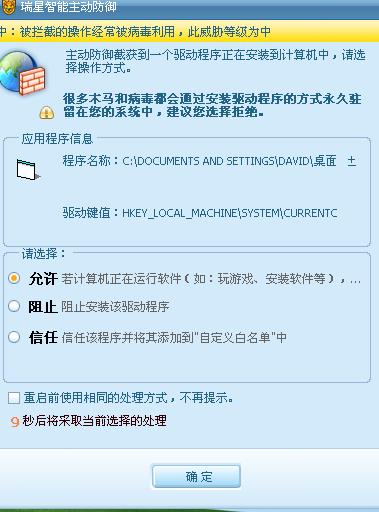 见附件,测试允许安装则瑞星主力进程被杀,虽然有提示,但是默认是允许安装,而且只有7秒时间反应,