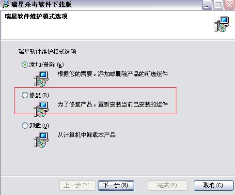 我按开始 程序 瑞星杀毒软件 添加和删除组件 没用啊!弹出来的是安装瑞星的程序,没有修复的窗口弹出来啊!恐怕只有重装!