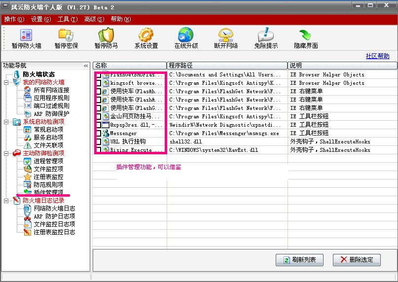 建议三:这个插件管理功能可以借鉴,虽然卡卡有此功能,但在将来新用户群培养过程中,考虑用户在选择安全产品时,不一定会选择瑞星全套,由此,可以考虑将此功能和系统漏洞修复功能添加进去。尽可能使新用户使用起来觉得功能更齐全、很实用。