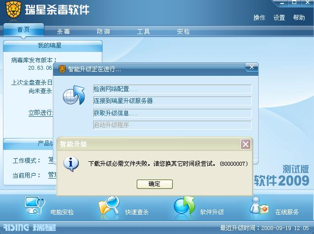 1.从瑞星杀毒软件安装目录C:\Program Files\Rising\Rav(这是默认安装的,根据自己情况而定)下找到downloads这个文件夹,并删除,重新升级。如果还有问题,卸载杀毒软件,卸载时选择删除安装目录,重新安装,再尝试升级。