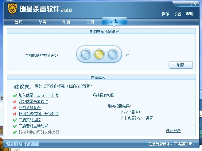 问题现象:在安检时显示升级杀毒软件 可是 我已经更新了 系统漏洞我也扫描了