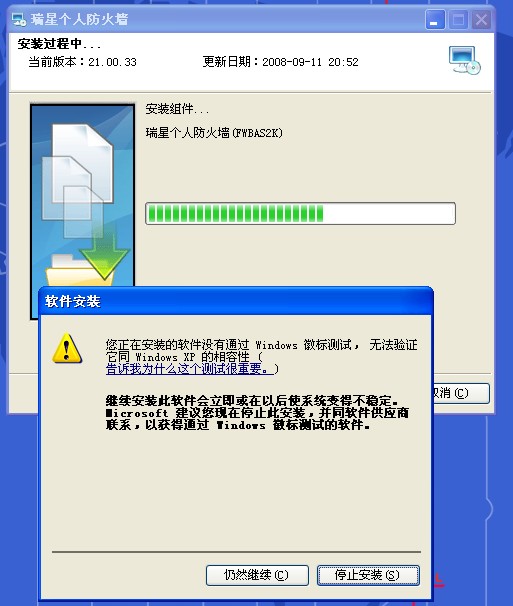卸载旧版,安装瑞星防火墙2009问题能否复现:必现