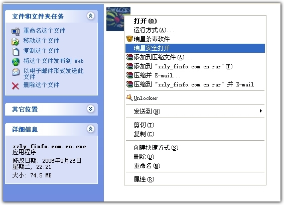 右键菜单的“瑞星安全打开”功能——当U盘有autorun病毒,双击U盘可能报错提示无法打开,这时候用“瑞星安全打开”能打开资源管理器来浏览U盘,这种打开方法也避免运行U盘上的autorun.inf