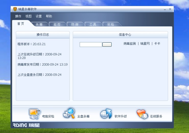 修复方法:把瑞星安装文件夹下面的update文件夹里面的rsconfig.cfg文件复制粘贴到电脑的C:\Documents and Settings\All Users\Application Data\Rising\Ris此路径下,之后点击【开始】【所有程序】【瑞星杀毒软件】【添加删除程序】里面的修复选项,修复一下软件,看看可不可以解决问题~:default7:
