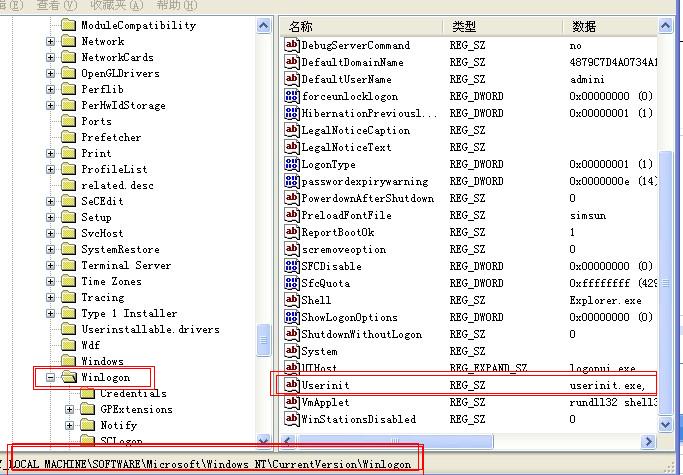 HKEY_LOCAL_MACHINE\SOFTWARE\Microsoft\Windows NT\CurrentVersion\Winlogon键下的Userinit字符串