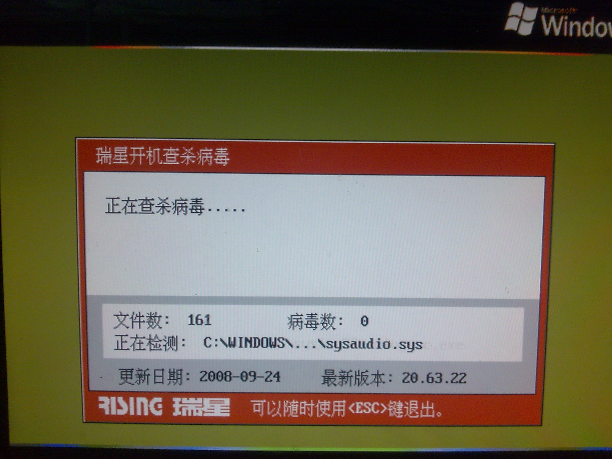 最近装的是HOST  XP  SP310.0的系统,等把瑞星杀毒软件装完后,开机的时候会出现瑞星扫描C盘的界面,但是界面是黄颜色,是怎么回事情?等把瑞星杀毒卸载了,所有的问题就好了!!!其中防火墙和卡卡都可以用