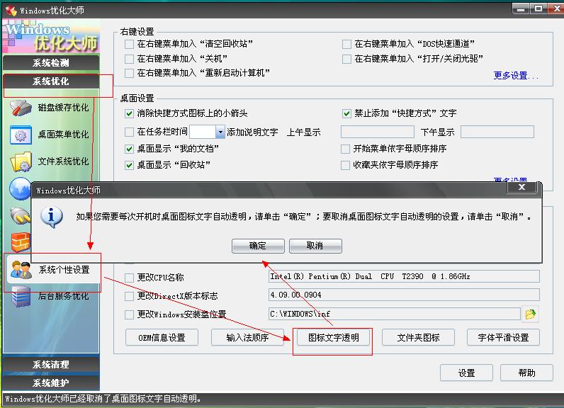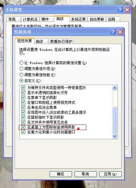 桌面图标选中解决:电脑|属性|高级|性能项的 设置|自定义|在桌面上为图标标签使用阴影|打上勾|