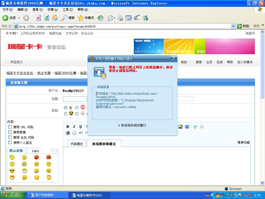 (3)在进入卡卡论坛的时候,瑞星提示网页有恶意代码,建议关闭,