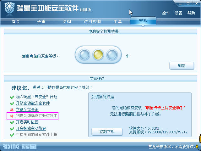 首页 » 企业产品讨论区 » 瑞星2009公测 » 瑞星2009测试版问题反馈 » 瑞星全功能安全软件2009公测 » 希望将漏洞扫描整进来