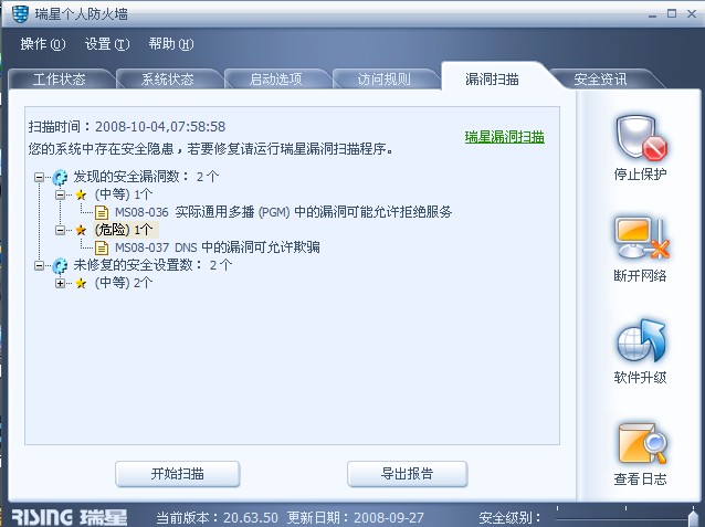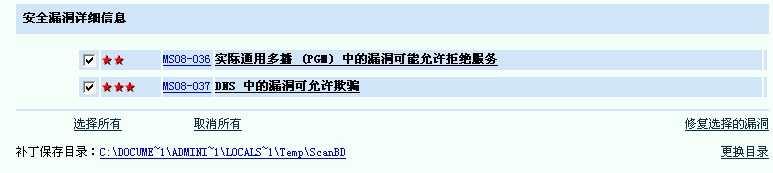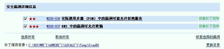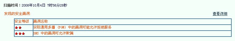 这一个月以来,我用瑞星漏洞扫描程序扫描到我的电脑有两个漏洞,用了个人防火墙的漏洞扫描程序来修补漏洞,虽然那程序提示已经安装补丁完毕,但是下次仍旧能够扫描出来那两个漏洞,无论我进行多少次修补,始终无法修补这两个漏洞。而且不是一天两天的事情了,我既用了个人防火墙的漏洞扫描程序,又用了杀毒软件的漏洞扫描程序,但是都是一样的结果,请工程师给出指导!附图如下: