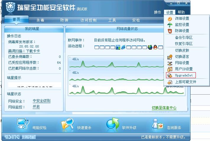 问题现象:点击瑞星软件主面板的设置按钮,最后第二个“升级设置”选项字体为英文