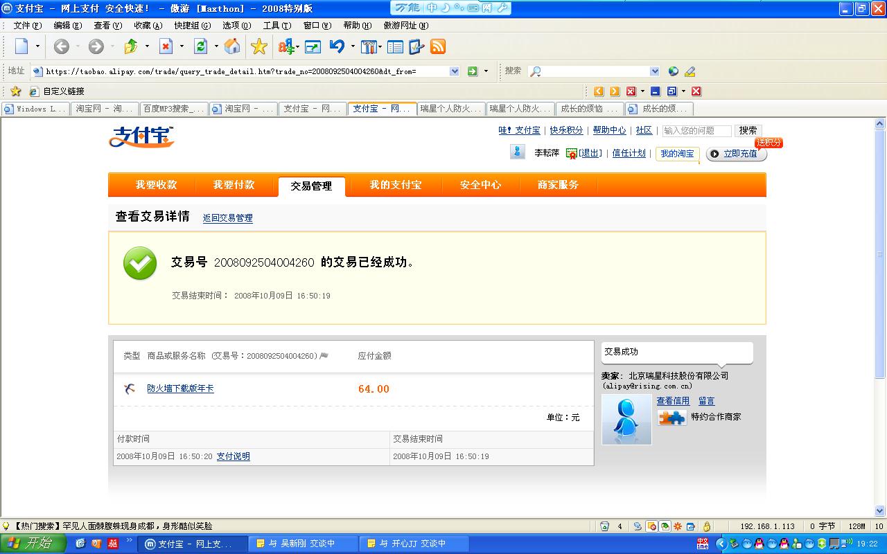 你好,以上是我通过支付宝购买的防火墙年卡64元信息,我选用的是即时到帐交易,但却没有给我序列号,这是为什么呢,是否可以帮我查查,请给予答复。(以下附件中电脑截图)