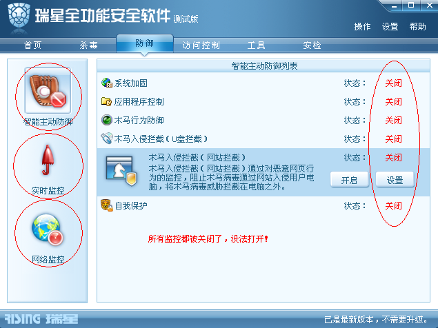 点击开启瑞星监控后出现如下情况点击访问控制选项卡后出现如下情况: