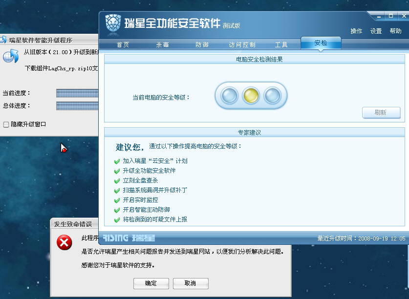 瑞星正在升级,出现以下错误,不过升级完毕后,再次重启后,软件正常了。