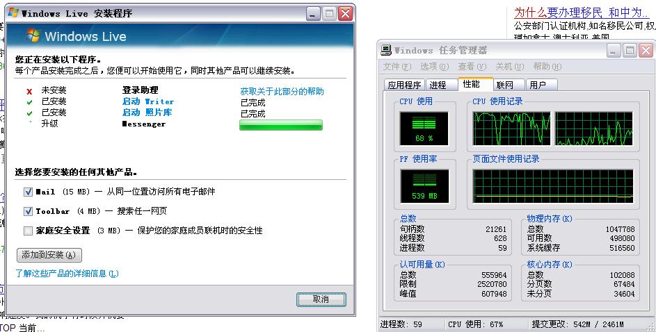 现象描述:用windows medie player 听歌时,突然很卡,结束进程,再次打开提示未正常关闭,某些插件损坏还是关闭了,记不清了,应该是和windows live message音乐插件有关的。之后系统声音就异常了,有沙哑的声音,咔嚓咔嚓的,重启后现象依旧,重新安装声卡驱动也没用,并且开机声音就不流畅,有沙哑不连续感,开机时间变长,桌面文件显示出来时间变长,鼠标经常有停顿感,CPU好像经常只有一个核在工作,以前可不是这样的,下面贴张图,为安装msn时CPU性能画面,以前这点工作量应该算是小case, 现在一个核满负荷,另一个基本不工作,机器卡。排除病毒因素,个人电脑平时维护较好,而且刚杀过,没毒。个人不倾向于重装系统,因为要装的软件太多了,而且重装之后不一定能解决此问题,因为装台式机碰到过类似问题,重装不能完全解决。