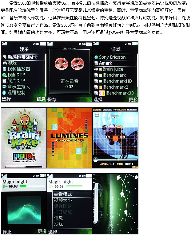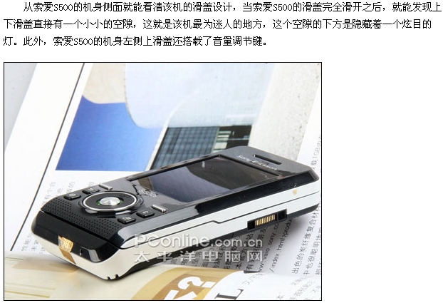 索尼爱立信于07年5月在上海举办了主题是“超越 合作 共赢”的2007中国峰会暨新品发布会,会上共计发布了四款新机,其中就有一款稀少的S系列机型。索爱S系列的手机定位和W和K系列的机型定位稍微有点区别,这款最新的S500使用的是滑盖设计,整体的外形和索爱W580极为类似。索爱S500将会有两种时尚的颜色搭配,包括峻峰黑和春蕾黄。S500更强调设计的活力、动感,桌面视觉效果和手机菜单可以随季节变换和日夜轮回而自动变幻。