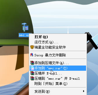 桌面上成功复制了 mmc.exe,再右键它,选择添加到“mmc.rar” OK ,大功告成了。(很简单吧,希望大家都会哦。)