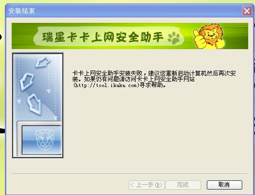 【开始】【运行】输入regedit进入注册表,打开注册表里面HEKY_LOCAL_MACHINE找到SOFTWARE文件里面的rising文件夹删除里面的KAKA和KaKaToolBar文件夹,然后再重新安装一下。