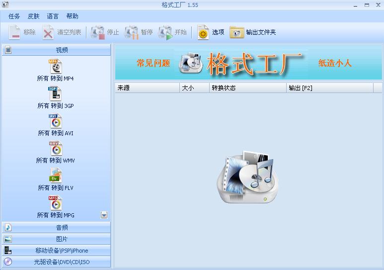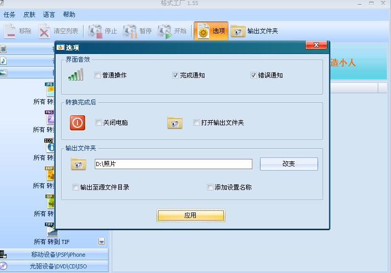 用MP3的MP4的,同学大家都知道,在,格式转换 是头等难题,今天我在,电脑报上面看到,一个,格式转换软件,包含的功能很多,从普通的,音频到,视频到,图片到 移动设备的格式转换,来了一个大的集合, 这个软件叫,格式工厂,本来想,把图片 也发在 上面让大家看看的,不知道怎么回事 ,老是提示,无效的图片文件 真是郁闷,不过如果大家喜欢的话,就下载下来,试试,最新版是,1.55 ,,打开后,在选项当中,设置,输出文件的,地址,大家可以自己设置,