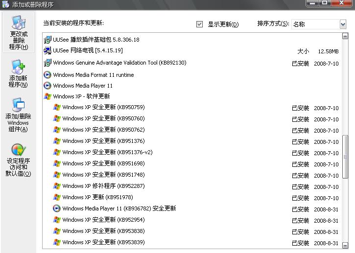 ^_^,可能还没有说清楚,让大家误解拉,不好意思。看到我的截图没啊,把“显示更新”钩上,看到下面的windows xp 软件更新下面的补丁吗?在这里查看那两个补丁,然后卸载掉,哈哈,肯定明白了拉!