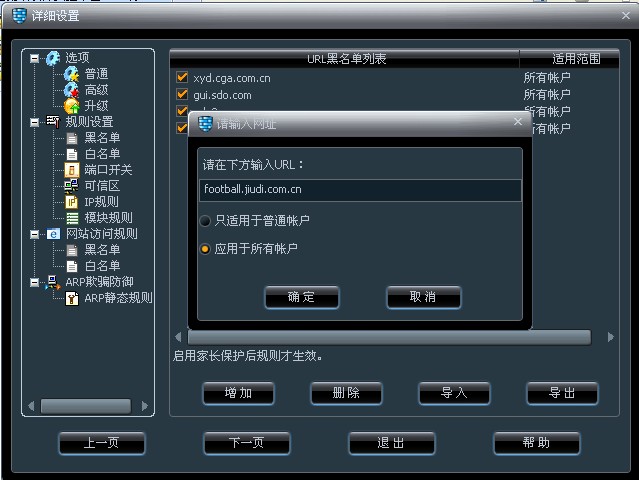 网址过滤下面的黑名单——football.jiudi.com.cn——确定